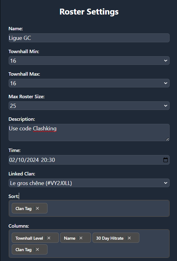 Name: Name of your roster TownHall Min: Min Townhall level to sign upTownHall Max: Max TownHall level to sign upMax roster size: Number maximum of players that can sign upDescription: Add any info you want to share with the playersTime: Date on which registrations close, or on which the event startsLinked Clan: The roster must be tied to a clan to use specific commands like roster missingSort: Sort the players depending on the filtersColumns: You can choose up to 4 columns to be displayed on the roster embedSignup groups: You can add groups that you created with/roster groupsso players can sign up to those groups (for example a main group and a sub group).Image: If you want to display an image at the bottom of the embed