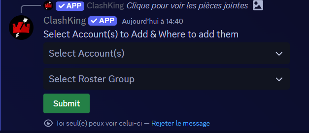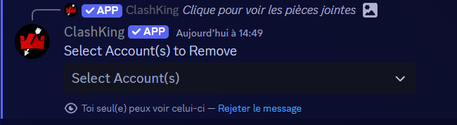 Once you clicked on it, ClashKing Bot will send a message on the bottom of the channel, which will allow you to choose one or several account to add.
