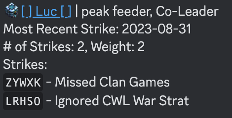You might be upset by a member who seems to repetedly not follow the clan rules. By viewing the strikes, you can have a summary of everything that have been reproached to them.