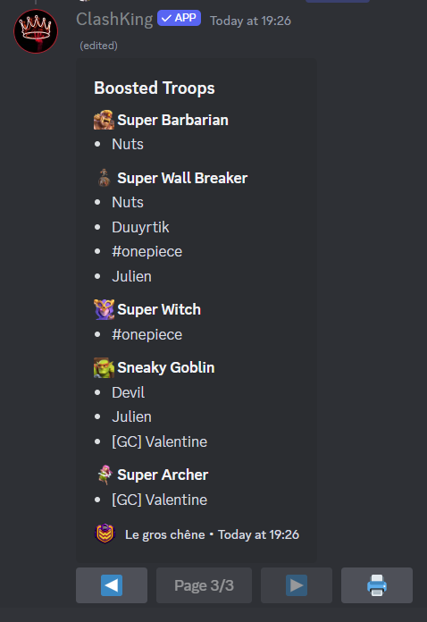 /boosts {clan} {super_troop} vous permet de voir qui a boosté quelles troupes dans un clan spécifique.