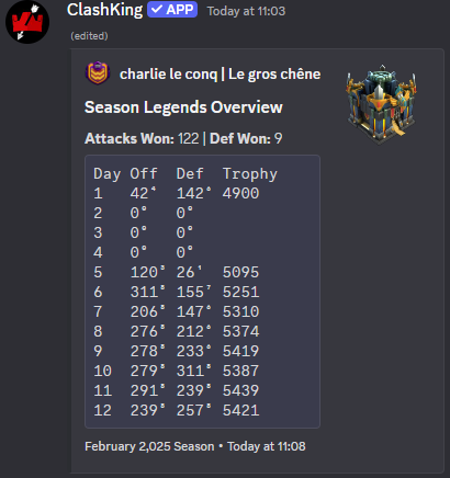 Le bouton "Aujourd'hui", qui est la vue par défaut, vous montrera le nombre d'attaques/defenses, les trophées que vous avez gagnés/lost, les classements mondiaux et nationaux, les trophées par attaque et défense, l'équipement du héros utilisé, et une image sera générée pour résumer ces informations.