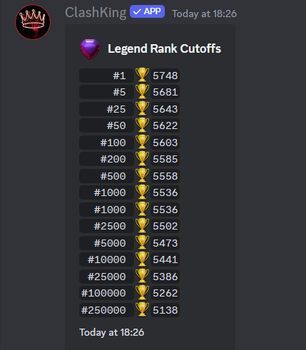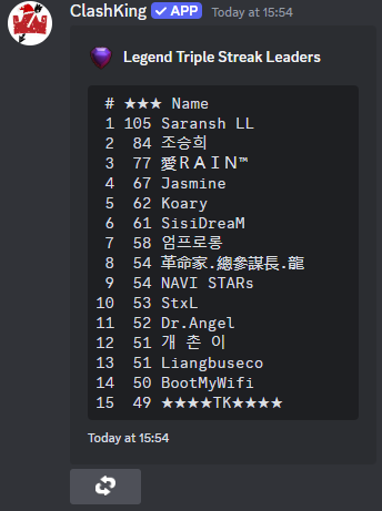 Affiche les joueurs légendaires avec la séquence de triples étoiles la plus élevée. Vous pouvez éventuellement limiter les résultats à l'aide du paramètre {limit} (un nombre compris entre 1 et 50).
