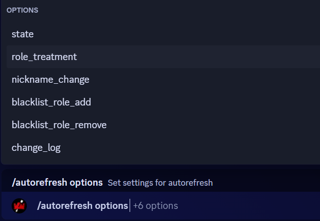 state: définir l'actualisation automatique sur ON/OFFrole_treatment: Il ajoutera et /or supprimera un rôle en fonction du rôle que vous avez défini dans Roles (TH & More).nickname_change: Cela changera le surnom en fonction des surnoms que vous avez définis dans Set up a server.blacklist_role_add: Une personne ayant un rôle sur liste noire ne sera pas impactée par l'autorefresh (elle conservera ses rôles et pseudos)blacklist_role_remove: Vous pouvez supprimer un rôle qui a été configuré dansblacklist_role_add.change_log: Si vous souhaitez voir les modifications apportées par le bot, vous pouvez définir un canal sur lequel il enverra les journaux de ses activités.