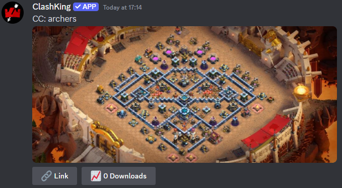 Avez-vous une bonne base que vous aimeriez partager ? Publiez simplement une photo de la base avec le lien de la base dans un seul message. L'analyse du lien le transformera en message, comme le montre l'exemple ci-dessous. Vous pouvez également inclure du texte normal dans le message qui apparaîtra au-dessus de l'intégration, par exemple en mentionnant la défense requise du château de clan !