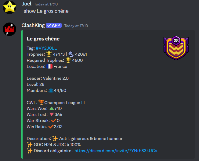 Vous avez ajouté votre clan à votre serveur Discord (en utilisant /addclan) et souhaitez afficher rapidement une intégration de votre clan ? Vous pouvez le faire avec -shown NameOfTheClan. Une intégration apparaîtra sous le message, comme illustré dans l'exemple ci-dessous.