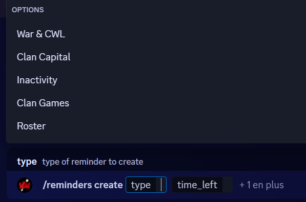 type:choisissez entre guerre et CWL, Clan Capital, Inactivité, Clan Games et Roster.time_left : temps restant avant d'envoyer un ping à vos camarades de clan. Utilisez des virgules pour saisir plusieurs fois.