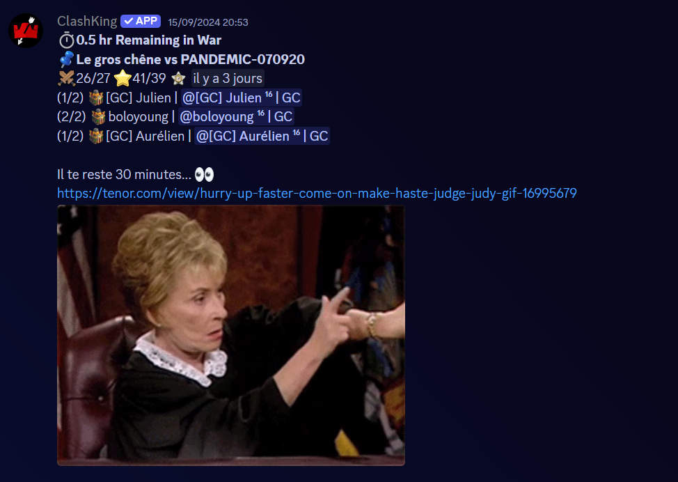 Pingez les utilisateurs qui ont des attaques restantes X heures avant la fin de la guerre (48h max). Un Gif peut également être utilisé !
