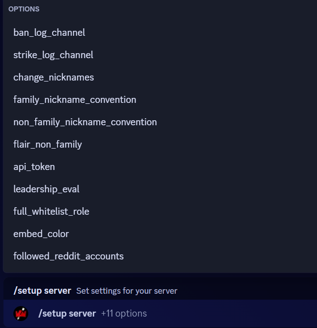 ban_log_channel: Lorsque vous bannissez quelqu'un avec la commande/ban(voir bans.md), il enverra automatiquement un message dans le canal que vous choisissez.strike_log_channel: Quant à la commande de bannissement, lorsque vous souhaitez ajouter un avertissement à quelqu'un avec la commande/strike(voir strikes), elle enverra automatiquement un message dans le canal que vous choisissez.change_nicknames: En choisissant oui ou non, vous autorisez ou non le bot à gérer les pseudos des membres de votre clan. Vous pouvez définir les surnoms avecfamily_nickname_conventionetnon family_nickname_convention.family_nickname_convention: Si vous avez autorisé le bot à changer le pseudo des membres de votre serveur, vous pouvez choisir comment les membres de votre famille de clans seront renommés.non_family_nickname_convention: C'est la même chose quefamily_nickname_convetionmais pour les membres de votre serveur qui ne font pas partie d'un de vos clans.