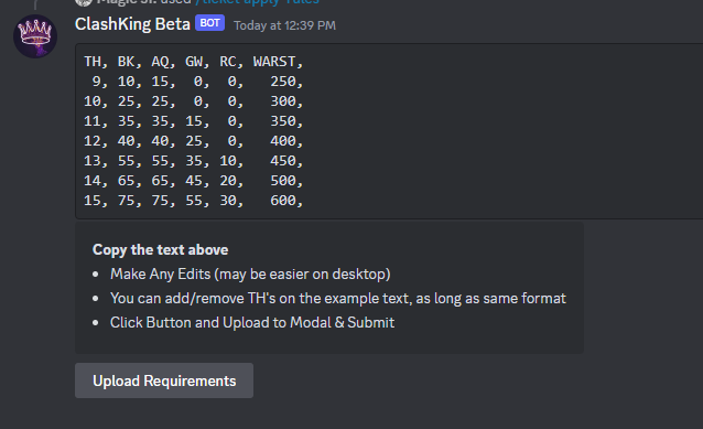 Nous pouvons cependant aller plus loin : les règles d'application /ticket nous permettent de filtrer les candidats au-delà du simple niveau de la mairie. Vous pouvez filtrer par niveaux de héros individuels ou par étoiles de guerre. Cette commande explique assez bien son fonctionnement une fois exécutée, mais voici à quoi elle ressemble. Copiez les exigences, en conservant le même format, modifiez-les, puis téléchargez-les à nouveau (celui donné n'est qu'un exemple et pas réellement la valeur par défaut sur laquelle tout le monde est défini)