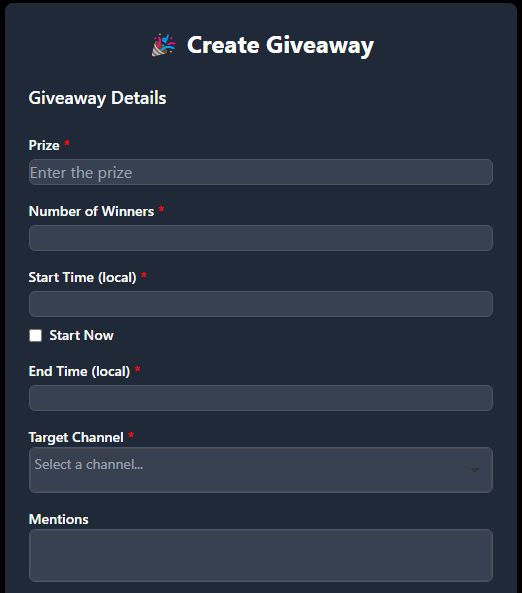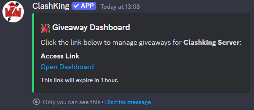 Vous pouvez gérer vos cadeaux à l'aide d'un tableau de bord de page Web. Vous pouvez obtenir le lien avec la commande /giveaway dashboard. Ce lien expirera 1 heure après avoir exécuté la commande.