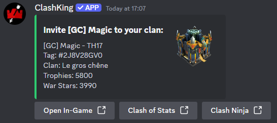 Heb je je clan toegevoegd aan je Discord-server (met behulp van /addclan) en wil je snel een insluiting van je clan weergeven? Je kunt dit doen met -showd NameOfTheClan. Er verschijnt een insluiting onder het bericht, zoals geïllustreerd in het onderstaande voorbeeld.