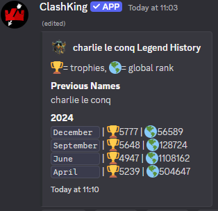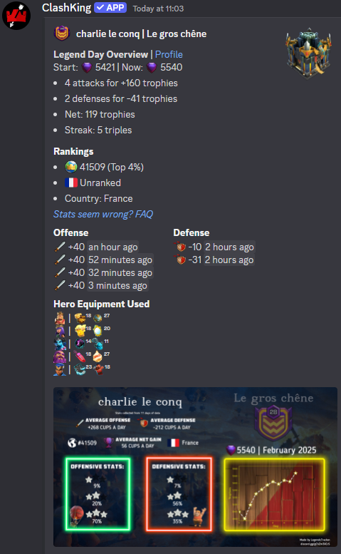 The "Today" button, which is the default view, will show you the number of attacks/defenses, the trophies you have gained/lost, the global and country rankings, the trophies by attack and defense, the hero's equipment used, and an image will be generated to summarize this information.