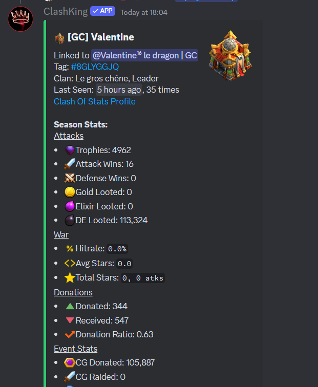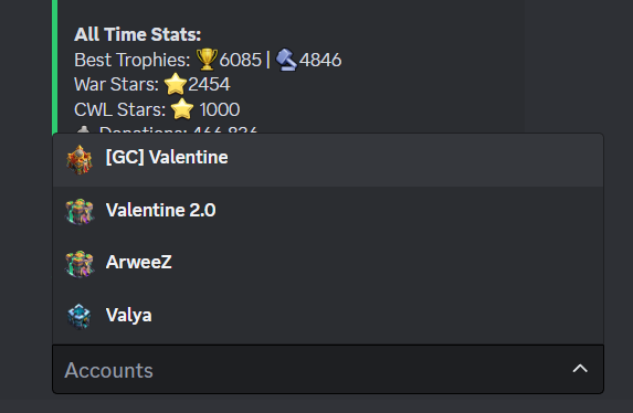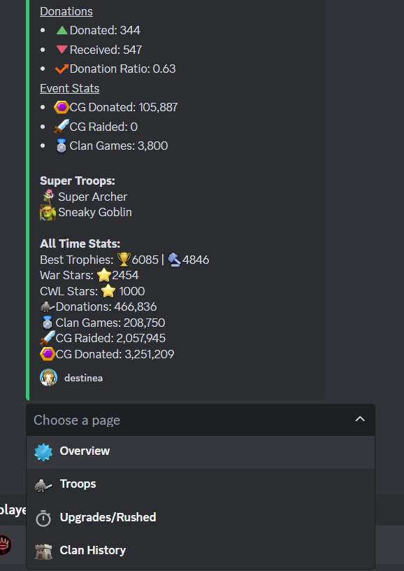 {player}which is the player tag of the account you want to lookup{discord_user}which is the discord username of the user you want to lookup.