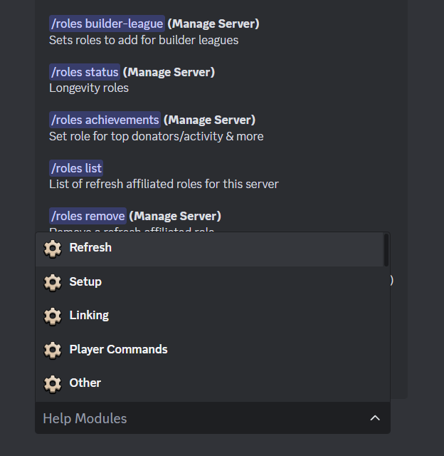 The /help {command} {category} command displays quick documentation for a specific command directly in Discord. You can search for a specific command or category, or navigate through the full documentation using the dropdown menu.